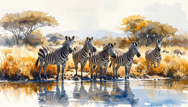 Группа зебр, стоящих у пруда в африканской саване, символизирующих сообщество, выживание и баланс естественных экосистем