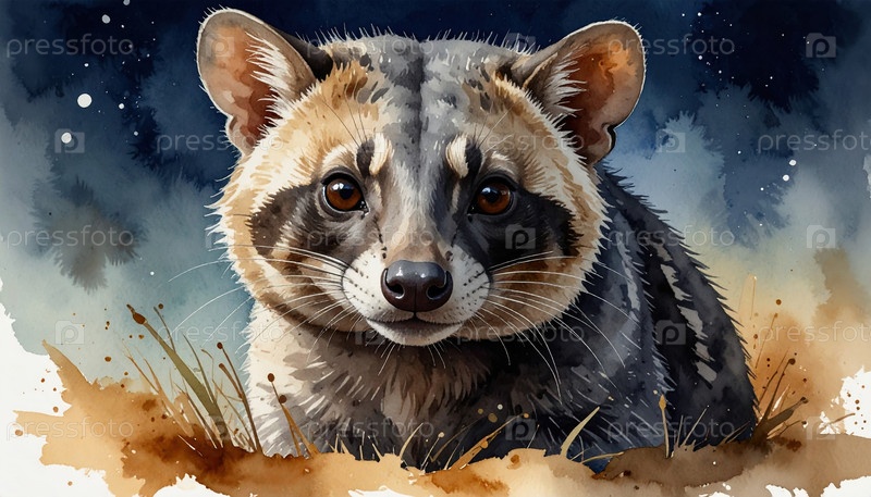 Акварельный портрет африканского цивета под ночным небом, представляющий красоту дикой природы и тайну ночной природы в художественном выражении