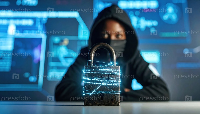 Хакер в темной комнате с зажженным замком, символизирующим угрозы кибербезопасности, защиту данных и осведомленность о цифровой конфиденциальности