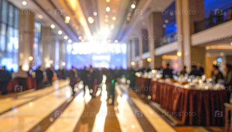 Элегантный бальный зал с яркими огнями и толпой, символизирующей праздничное деловое общение или праздничную атмосферу мероприятия, идеально подходит для корпоративных и социальных визуальных эффектов