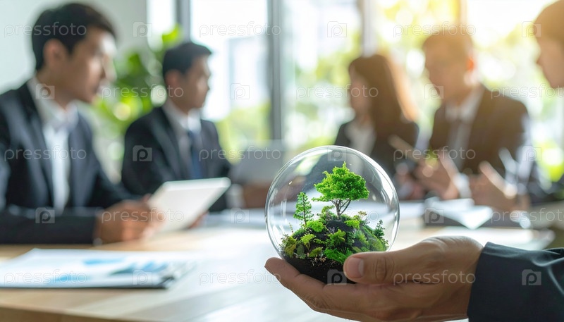 Концепция устойчивого развития с бизнес-командой, обсуждающей экологическую стратегию и держащей в руках стеклянный террариум, символизирующий зеленые решения будущего