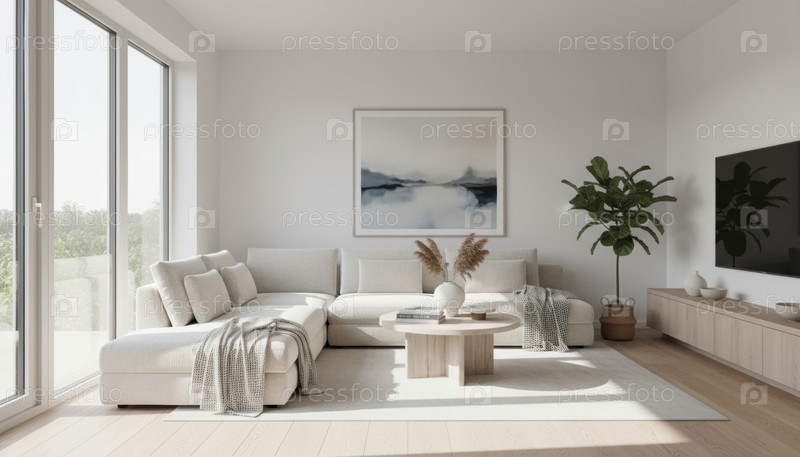 Яркая современная гостиная с минималистическим декором, уютным диваном и естественным светом, символизирующая расслабление, дизайн интерьера и тенденции устойчивого домашнего образа жизни
