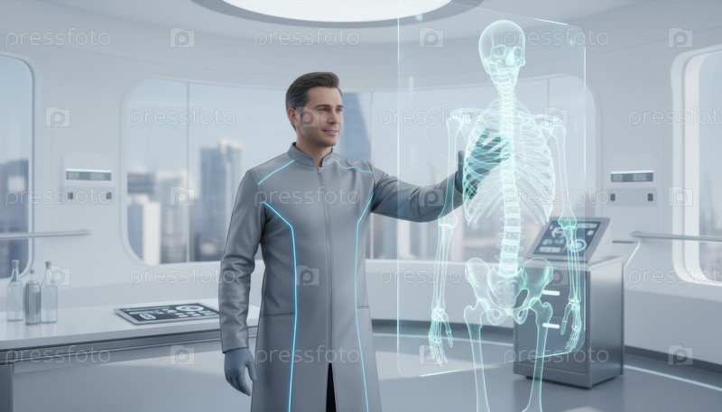 Футуристический врач взаимодействует с голографическим скелетным дисплеем, представляющим медицинские инновации, технологии здравоохранения и исследования в больницах будущего