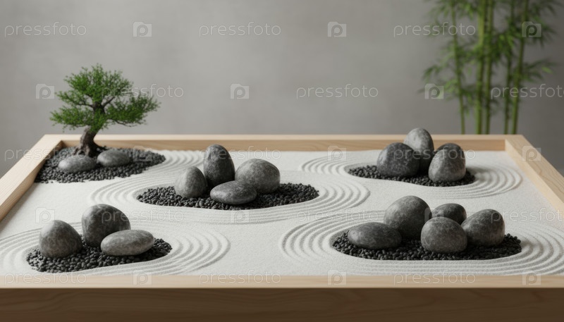 Минималистский Дзен-сад с грубыми песчаниками и деревом бонсай, символизирующим внимательность и спокойный образ жизни