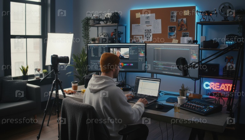 Творческое профессиональное видеоредактирование в уютной домашней студии с современным освещением и технологическим вдохновением для цифровых рабочих мест