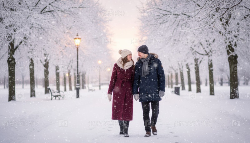Романтическая пара гуляет по заснеженному парку, наслаждаясь зимней атмосферой и сезонным спокойствием