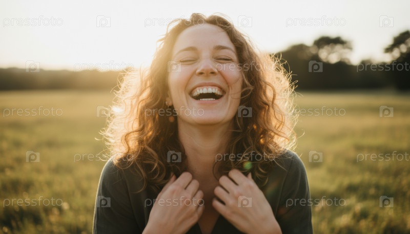 Женщина смеется свободно на солнечном поле, символизируя радость, внимательность и эмоциональное благополучие в природе во время золотого часа, идеально подходит для психического здоровья, благосостояния или позитивных кампаний