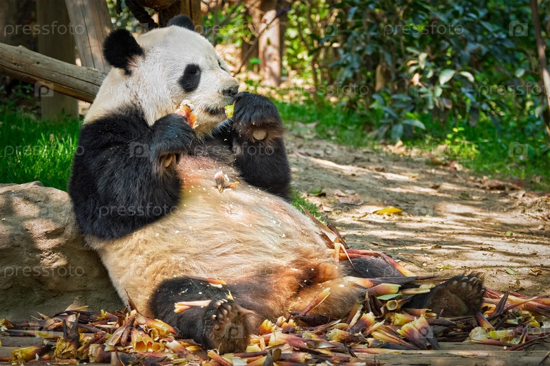 Китайский туристический символ и достопримечательность - гигантская панда, питающаяся бамбуком