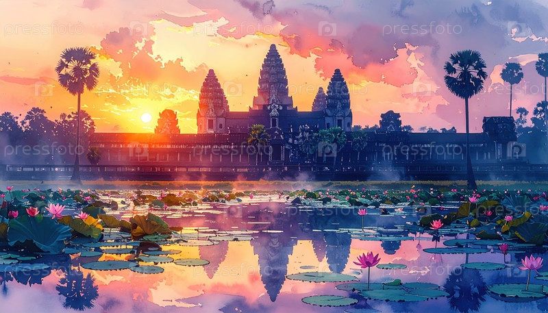 Силуэт Ангкора храма Ват на рассвете отражается на лотосовом пруду, представляя древнее чудо Камбоджи и духовный покой в концепции путешествия мирового наследия