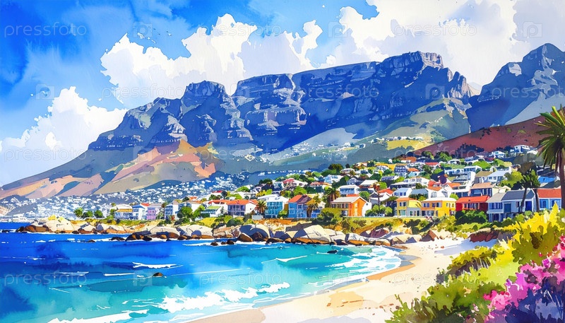 Красочный приморский город под величественным горным хребтом, затопленный солнечным светом, отражающим радость, разнообразие и яркую общественную жизнь у океана