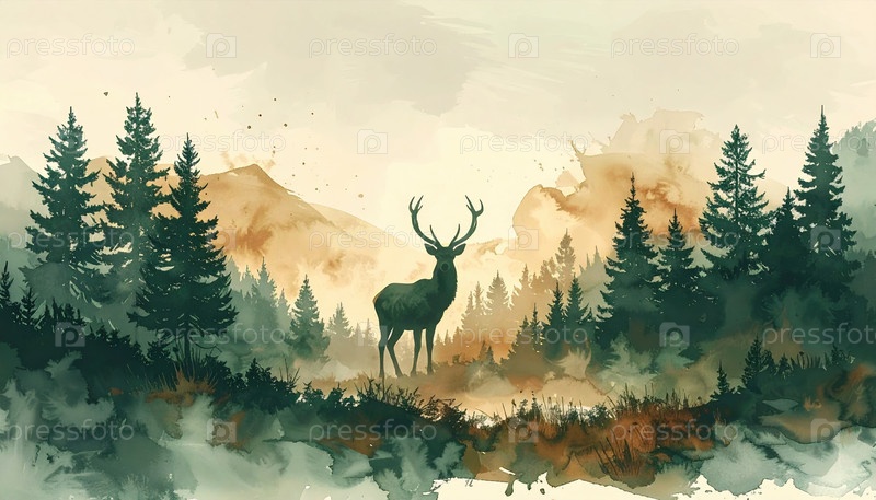 Величественный олень, стоящий в туманном лесу на рассвете, символизирует силу, изящество и связь между дикой природой и естественной гармонией