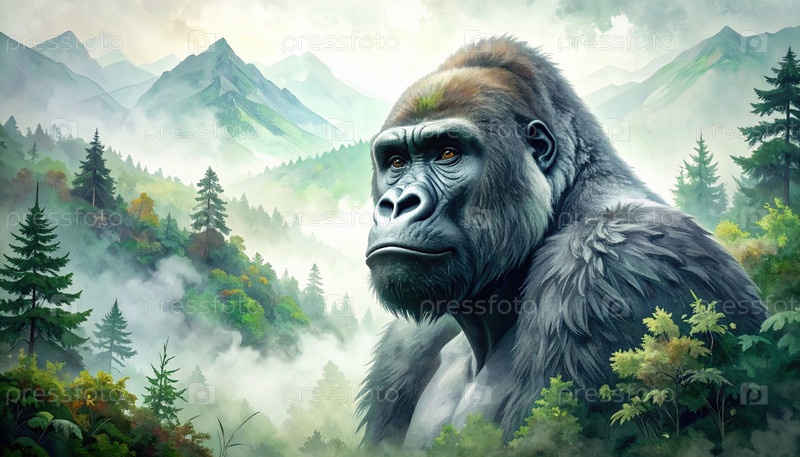 Гориллу окружает туманный горный лес, символизирующий интеллект, силу и глубокую связь между природой и исчезающей дикой природой
