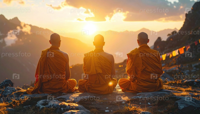 Три монаха медитируют на горе на рассвете, представляя себе мир, осознанность, духовность и связь между людьми и природой в атмосфере золотистого утреннего света