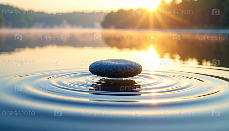 Гладкий камень, плавающий на спокойной воде с волнами при восходе солнца, вызывает равновесие, спокойствие и внимательность, символизируя медитацию, мир и гармонию с природой на рассвете