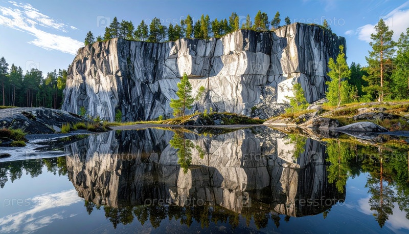 Величественный мраморный каньон отражается в тихом озере, окруженном лесом под голубым небом, представляя недотронутую природу, место для путешествий и красоту геологических образований