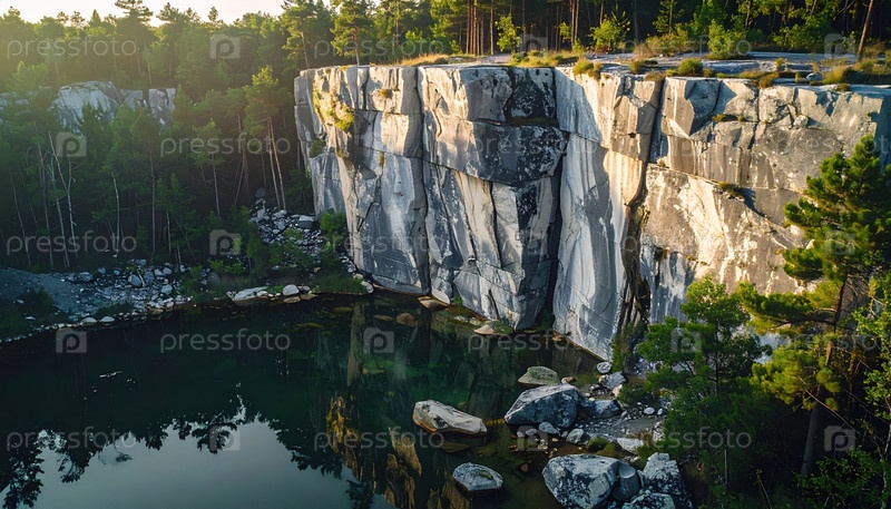 крутая скала с деревьями и озеро внизу отражает нетронутую природу, приключения и свободу подходит для путешествий, исследований или концепций экологического сознания