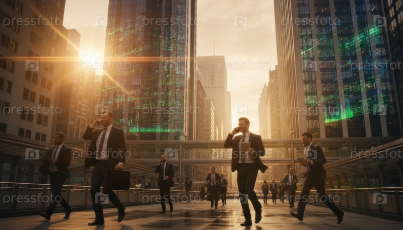 Бизнесмены, гуляющие по современному городу на рассвете сегодняшнего дня в час пик, амбиции и финансовый рост в динамичной городской среде с футуристическим цифровым перекрытием