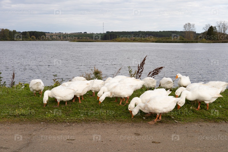 Домашние гуси пасутся у пруда в деревне