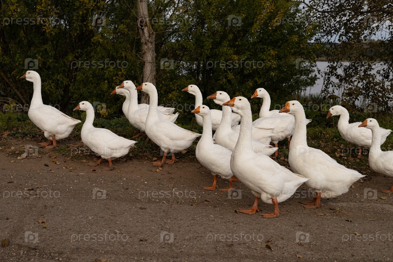 Домашние гуси пасутся у пруда в деревне