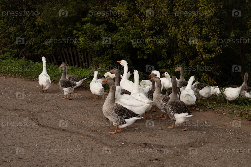Домашние гуси пасутся у пруда в деревне
