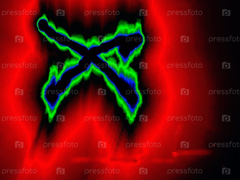 Геометрическая фигура изображена вручную цветными неоновыми линиями на черном фоне.Черный крест светит голубо-зеленым цветом вокруг краев, а его окружает красный ореол