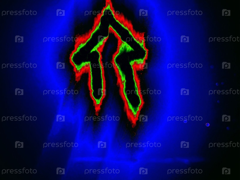 На черном фоне направляющая стрелка изображена вручную цветными неоновыми линиями.Она светит зелено-красным цветом вокруг краев, а ее окружает голубой ореол