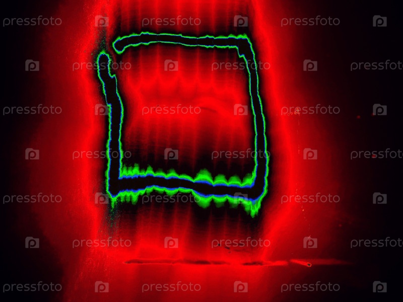 Светящийся квадрат.Геометрическая фигура изображена вручную цветными неоновыми линиями на черном фоне.Черный квадрат светит сине-зеленым краями, вокруг которого красный ореол