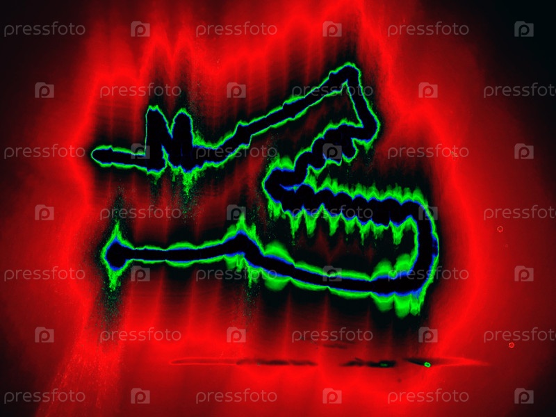 Сияющий крокодил.Геометрическая фигура изображена вручную цветными неоновыми линиями на черном фоне.Схематический чёрный крокодил светит сине-зеленым по краям, а вокруг него - красный ореол