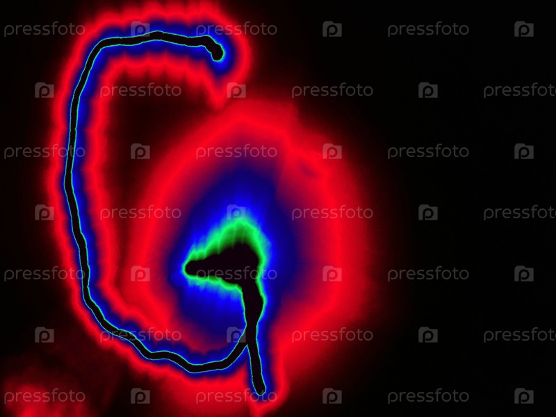 Буква английского алфавита написана вручную на черном фоне с цветными неоновыми линиями.Буква светит зеленым и синим краями, создавая вокруг себя красный ореол