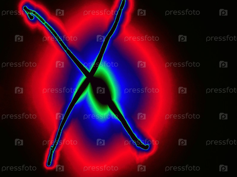 Буква английского алфавита написана вручную на черном фоне с цветными неоновыми линиями.Буква светит зеленым и синим краями, создавая вокруг себя красный ореол