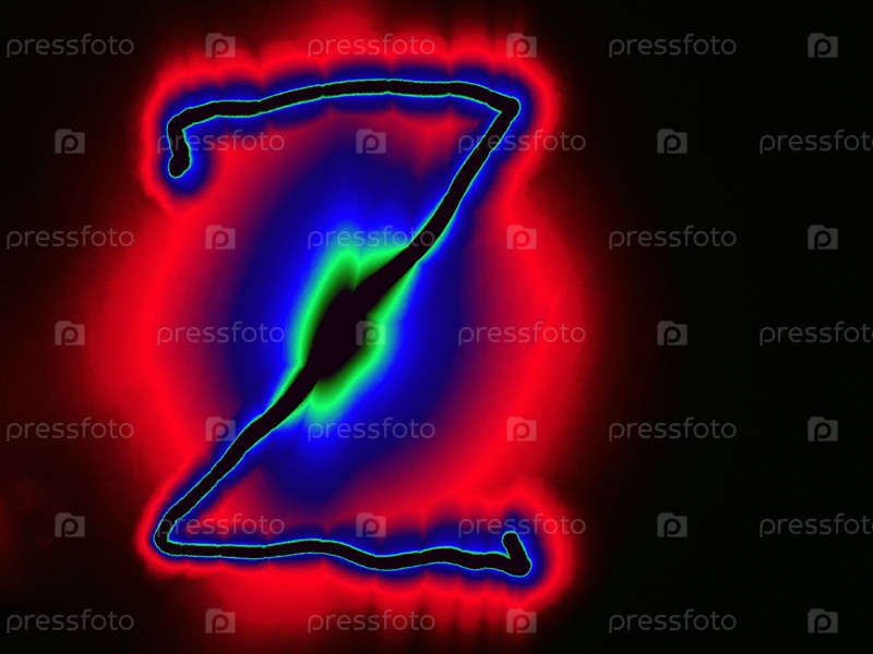 Буква английского алфавита написана вручную на черном фоне с цветными неоновыми линиями.Буква светит зеленым и синим краями, создавая вокруг себя красный ореол