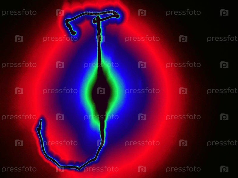 Буква английского алфавита написана вручную на черном фоне с цветными неоновыми линиями.Буква светит зеленым и синим краями, создавая вокруг себя красный ореол