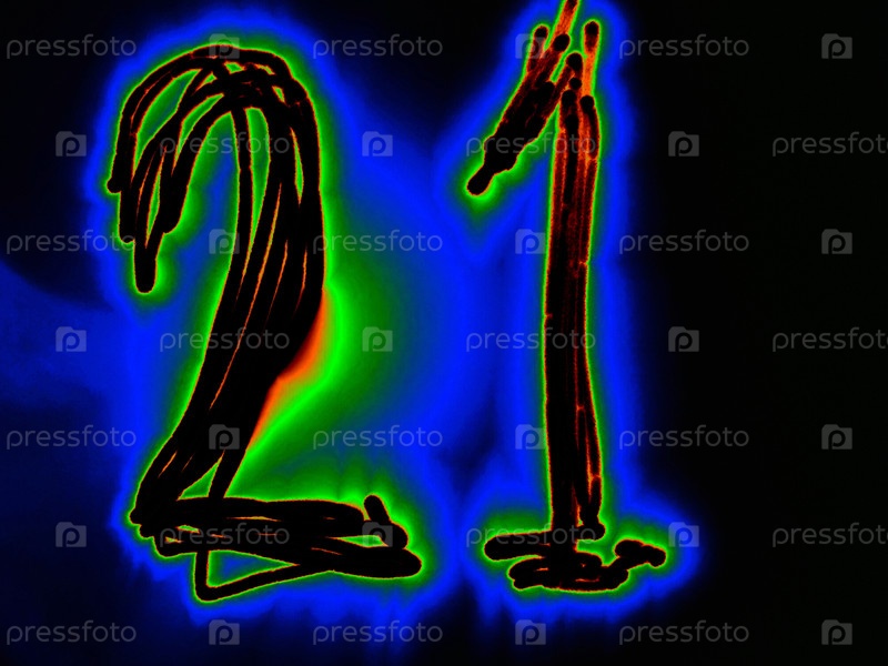 Радиативное арабское число 21 - это математическое число, написанное вручную на черном фоне с цветными неоновыми линиями.Черное число светит оранжево-зеленым цветом, создавая вокруг него голубой ореол