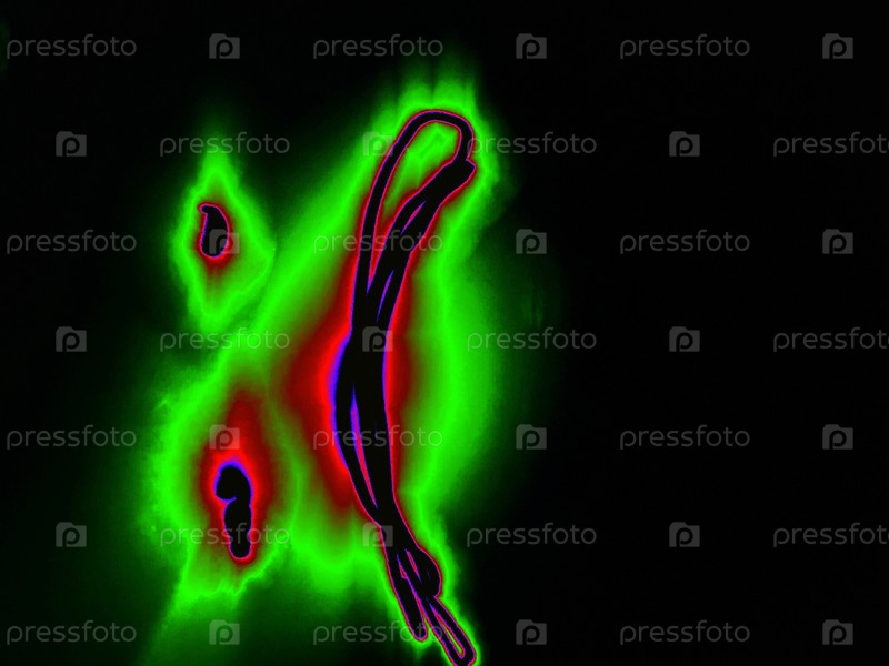 На черном фоне две точки и линия под ними изображены вручную цветными неоновыми линиями.Лицо светит фиолетово-розовым по краям линий, вокруг него зеленый ореол