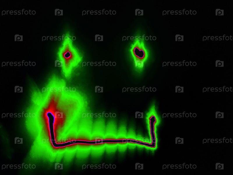 На черном фоне две точки и линия под ними изображены вручную цветными неоновыми линиями.Лицо светит фиолетово-розовым по краям линий, вокруг него зеленый ореол