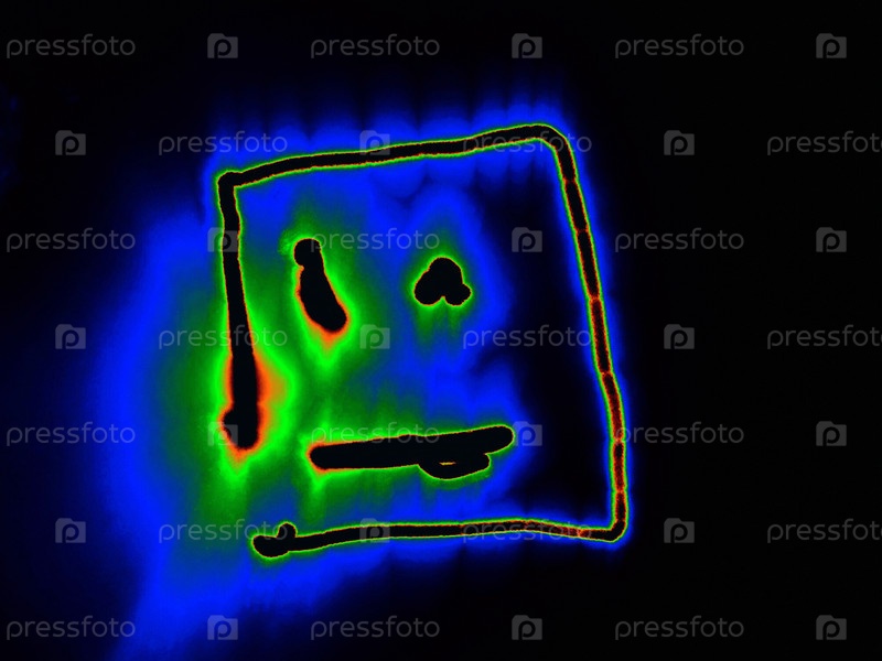 На черном фоне две точки и линия под ними изображены в квадрат с цветными неоновыми линиями.Лицо светится оранжево-зеленым по краям, вокруг него голубой ореол