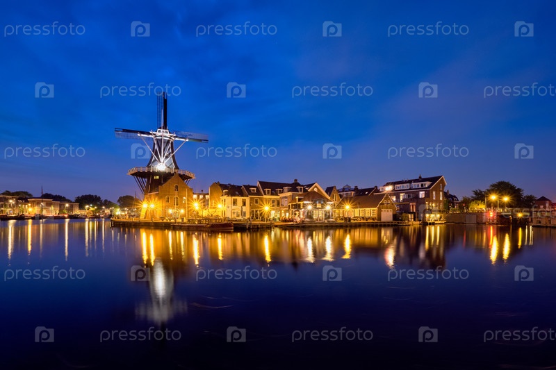 Вид на городской пейзаж Гарлема с достопримечательностью ветряной мельницы De Adriaan на реке Spaarn, освещенный ночью