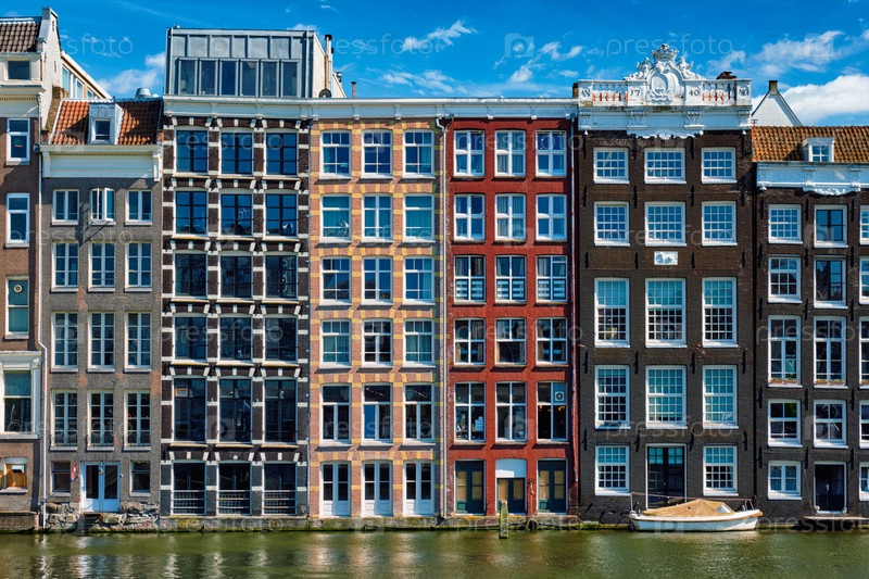 Дома и лодка на Амстердамском канале Дамрак с отражением