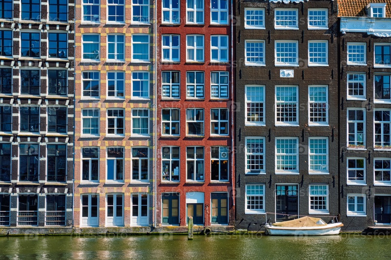 Серия типичных домов и лодка на Амстердамском канале Дамрак с отражением