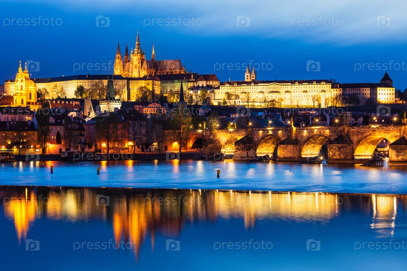 Вид на Карловый мост (самый Karluv) и Пражский замок в сумерках