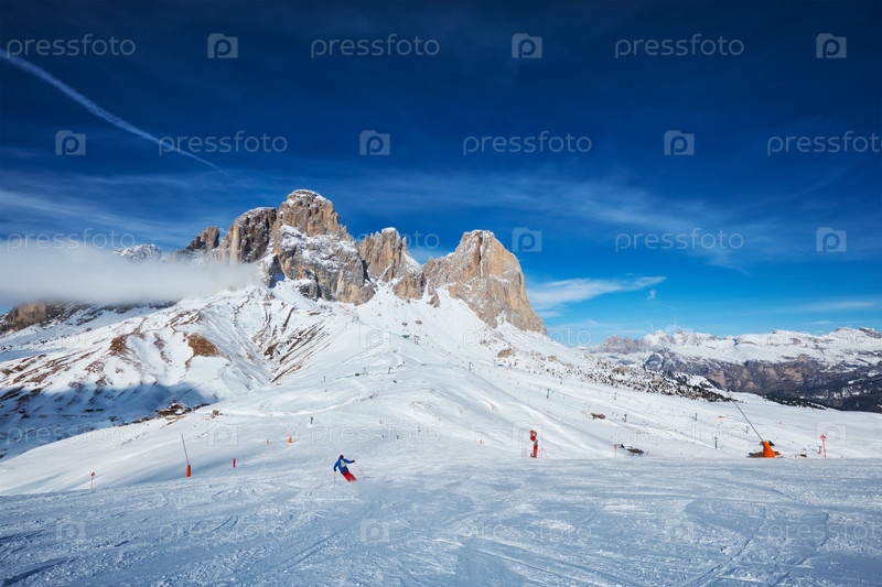 Вид на горнолыжный курорт Piste с людьми, катающимися на лыжах в Доломитах в Италии