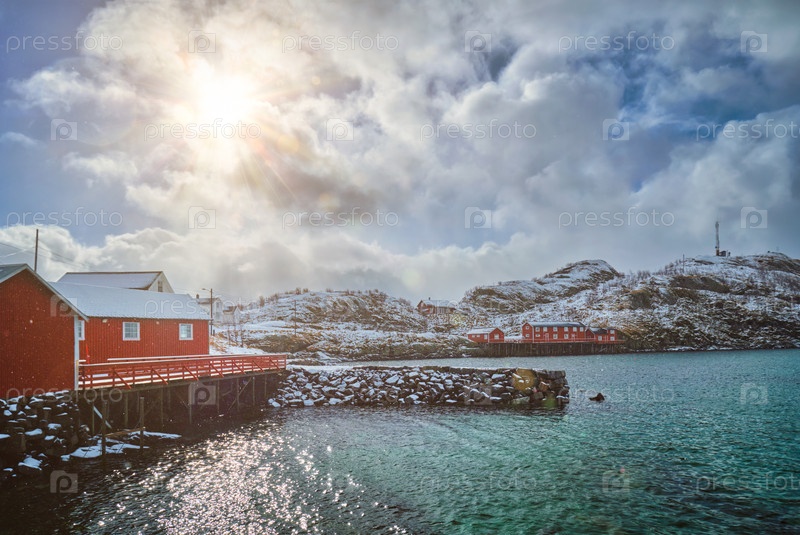 Красный рубль дома в деревне Сакрисой с снегом зимой.Острова Лофотен, Норвегия