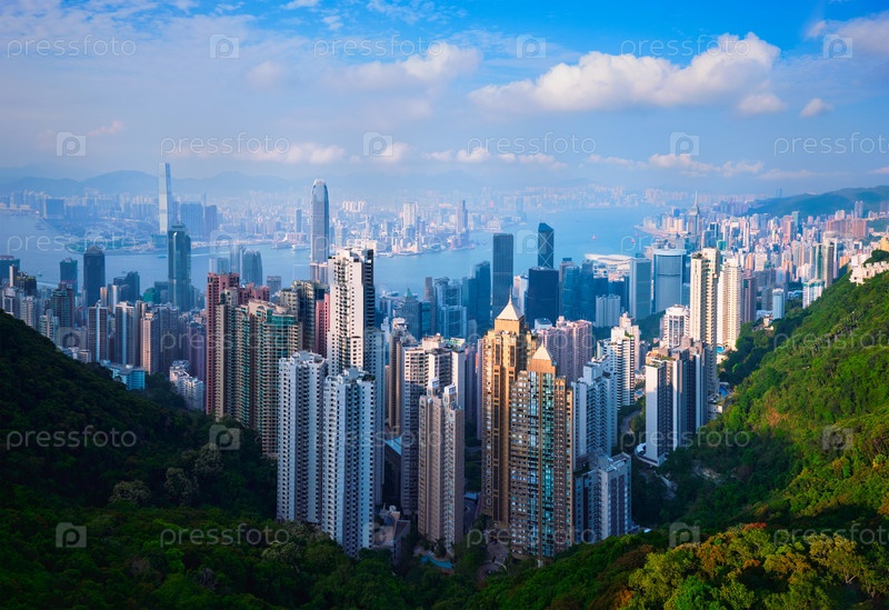 Известный вид на Гонконг - это небоскребы Гонконга, горизонт города и городской пейзаж с вершины Виктории при закате