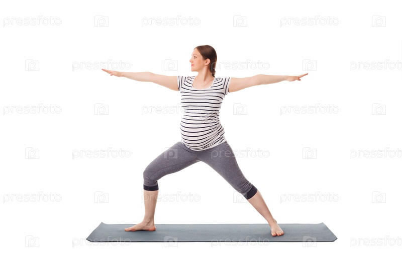 Йога-упражнения для беременных женщин, выполняющие асаны вирабхадрасана 2 - позы воина изолированные на белом фоне