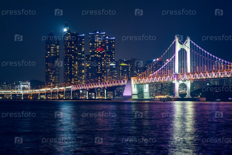 Мост Гванган и небоскребы освещаются ночью.Бусан, Южная Корея