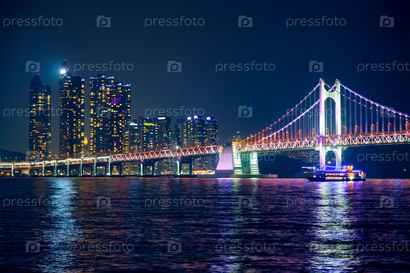 Мост Гванган и небоскребы освещаются ночью.Бусан, Южная Корея