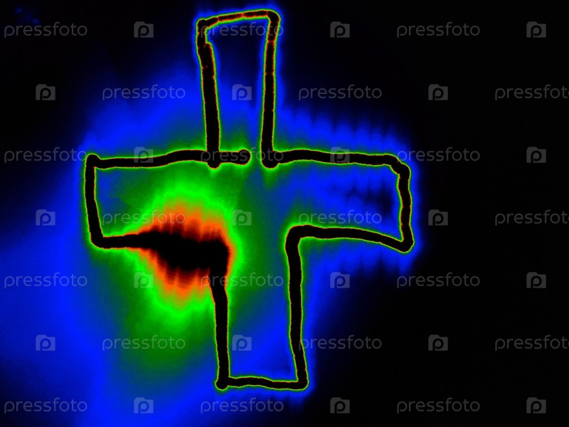 Геометрическая фигура нарисована вручную цветными неоновыми линиями на черном фоне. Она светит оранжево-зеленым цветом у краев линий, а вокруг нее голубой ореол