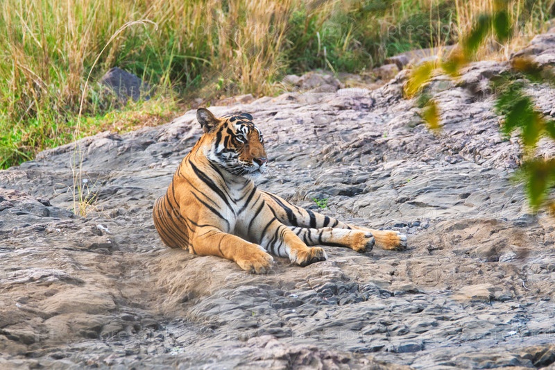 Королевский бенгальский тигр отдыхает в джунглях.Это популяция Panthera tigris, родом с индийского субконтинента.Это национальное животное Индии.Национальный парк Рантамбор, штат Раджастан, Индия