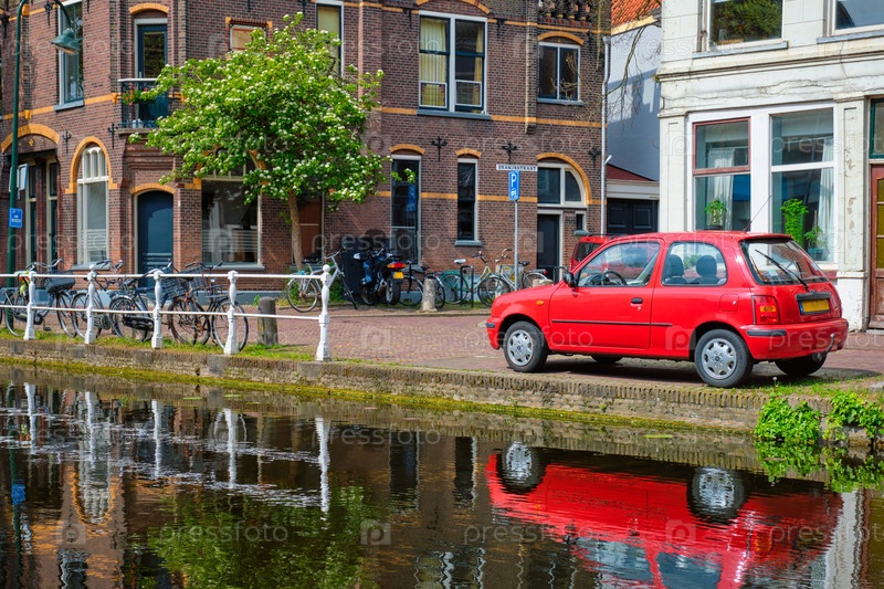 Автомобили на набережной канала на улице Делфт