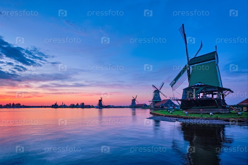 Голландская сельская сцена - это ветряные мельницы на знаменитом туристическом объекте Заансе-Шанс в Нидерландах при закате солнца с драматическим небом
